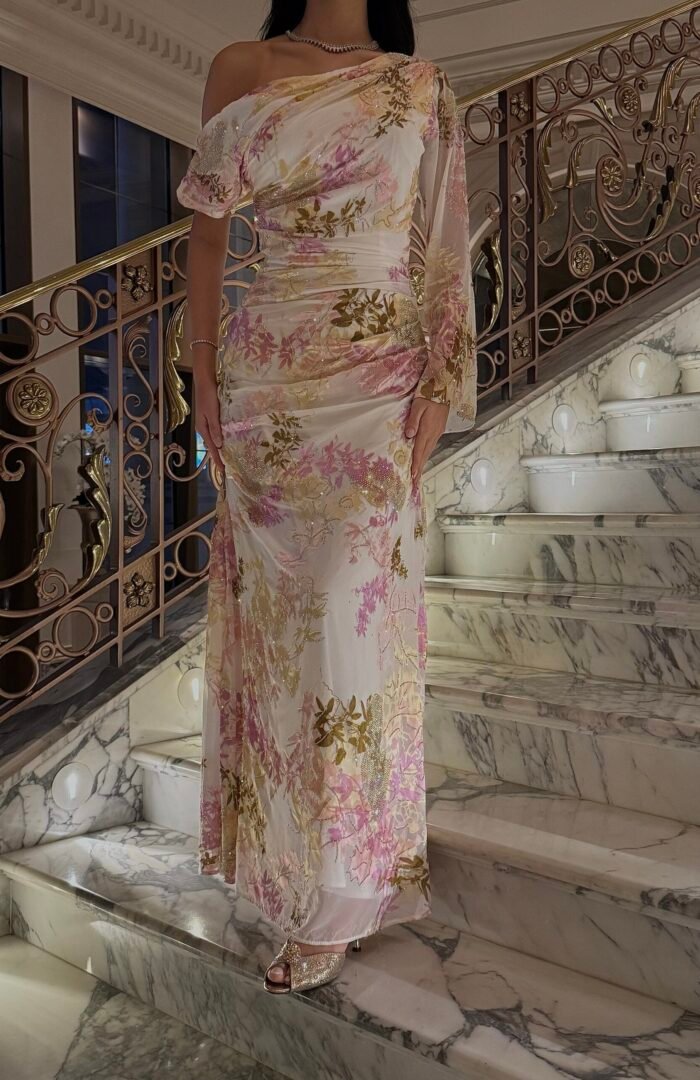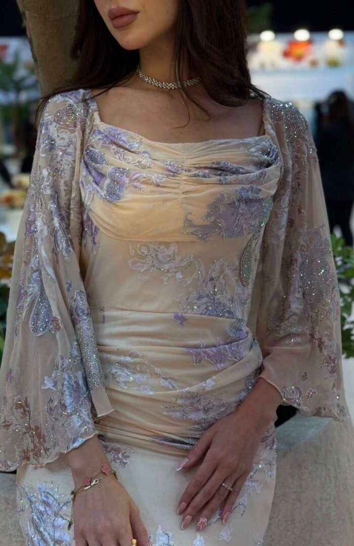 دانتيل فرنسي نااعم ومفصص بفصوص الكرستال المنثوره على الفستان