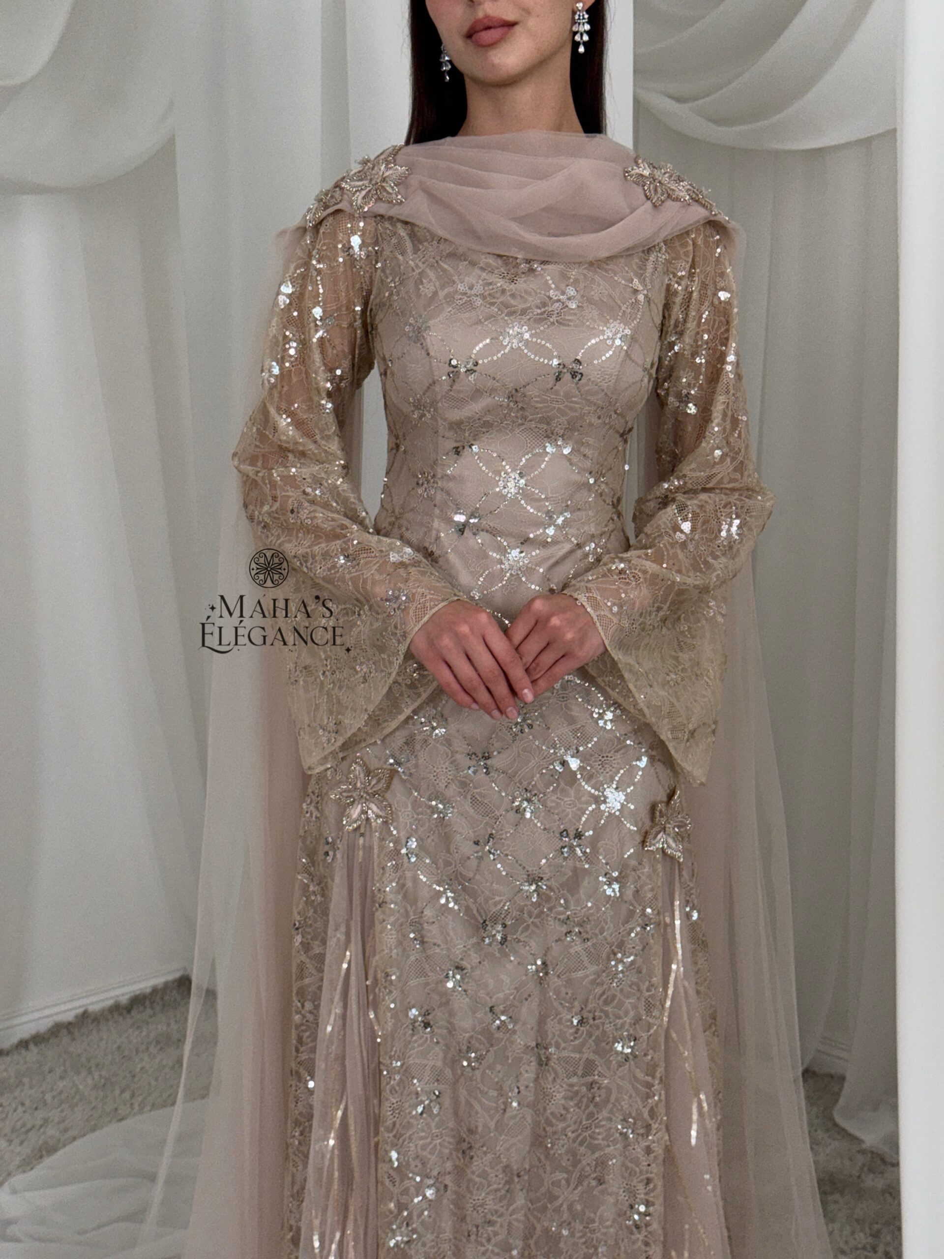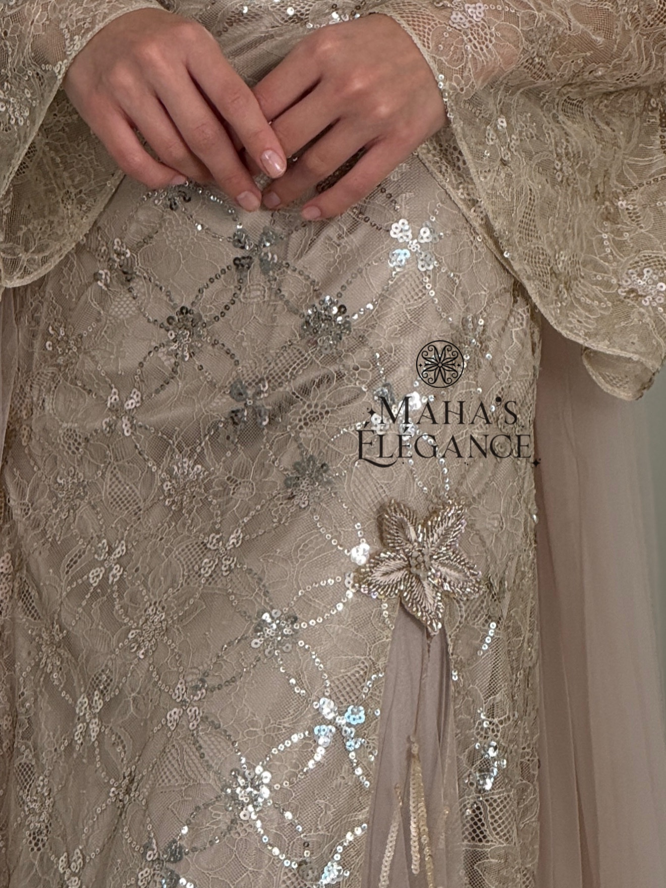 وعبايه من التور مزينه بالورود الثلاثية الابعاد المصنوعه يدوياً